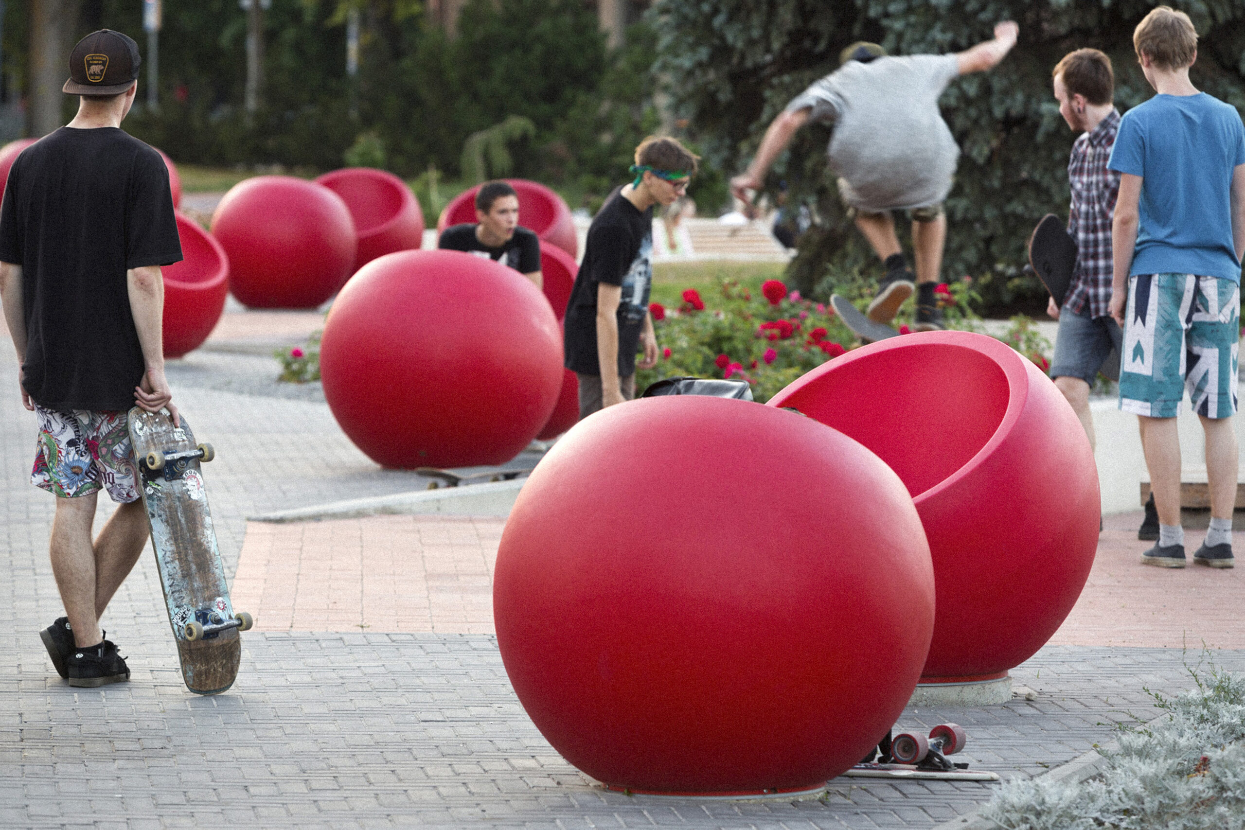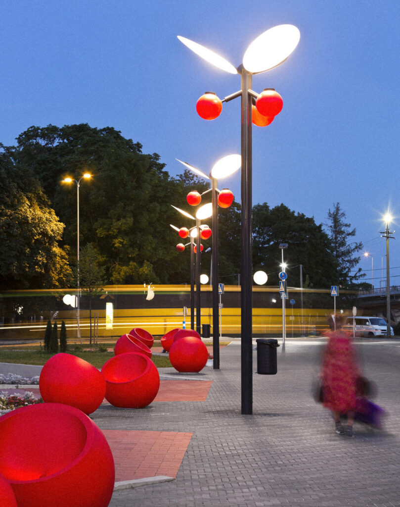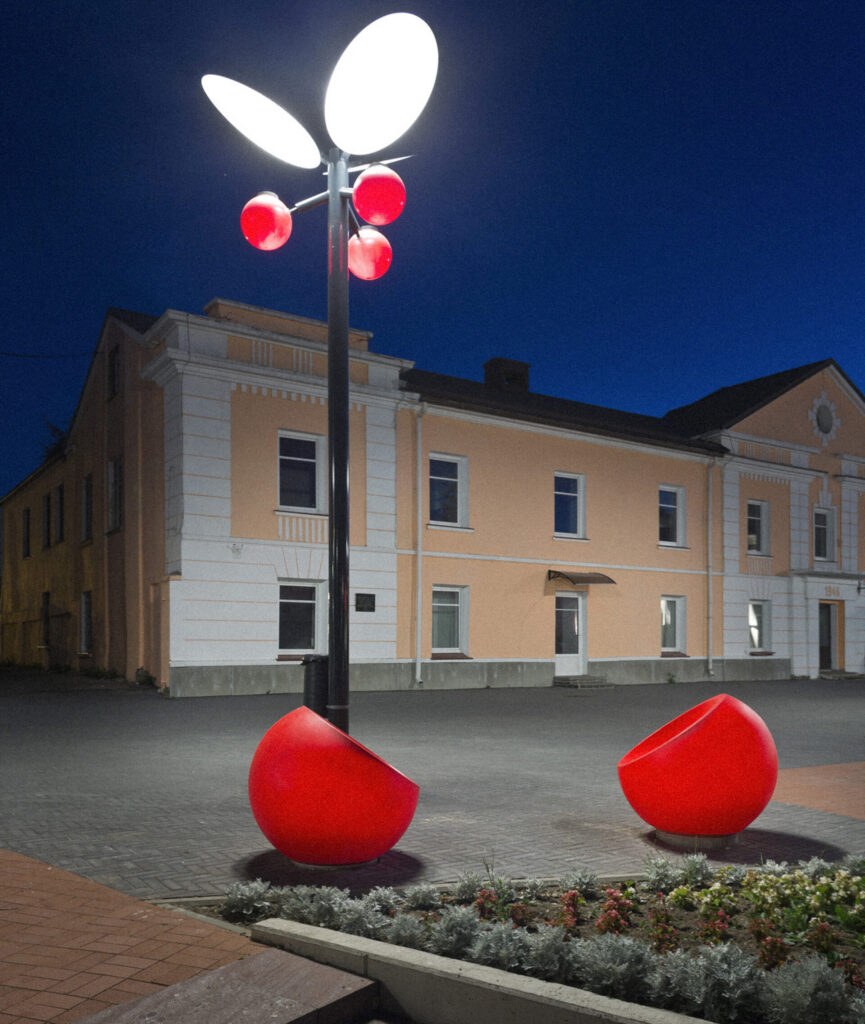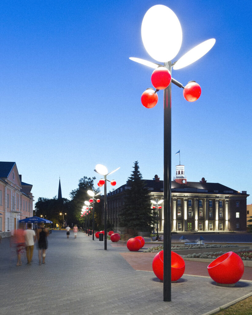 For Jõhvi in Estonia, we developed the Cranberry urban lighting and furniture series for the town centre. Commissioned by Jõhvi Parish, the concept is based on a wordplay between the town name Jõhvi and the Estonian word jõhvikas (cranberry), forming the basis for a unified lighting and street furniture design.