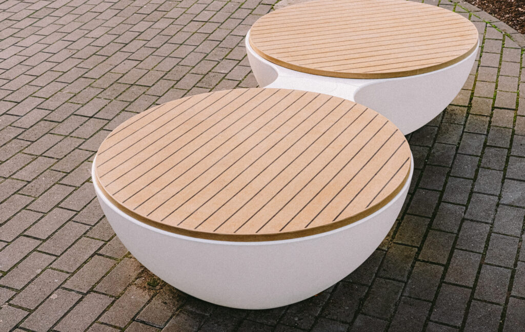Timpan urban seating element is manufactured from semi-transparent polyethylene using rotomolding technology, creating a durable, impact-resistant, and vandal-resistant body suited to urban environments.