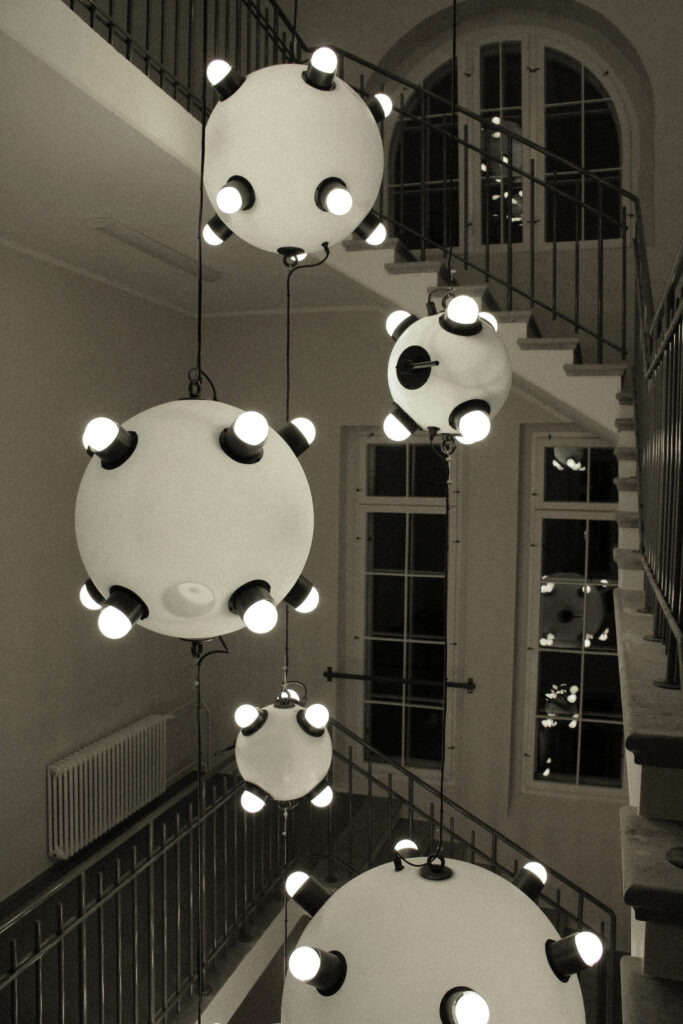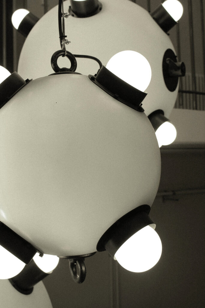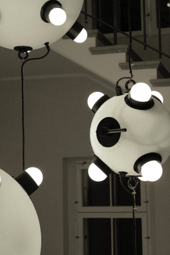 The installation consists of rotomolded polyethylene spheres in three sizes, each housing an internal light source. External angled light elements, resembling detonators, direct illumination toward stairways and exhibition areas, reinforcing the sea-mine motif.