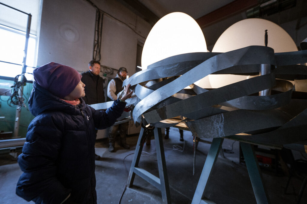 The illuminated eggs are manufactured from rotomolded polyethylene, a material we selected for its durability, weather resistance, and low maintenance in demanding climates, including seaside and Arctic conditions. The nest structure itself is formed from branches sourced from construction materials and carefully shaped to support the final composition.