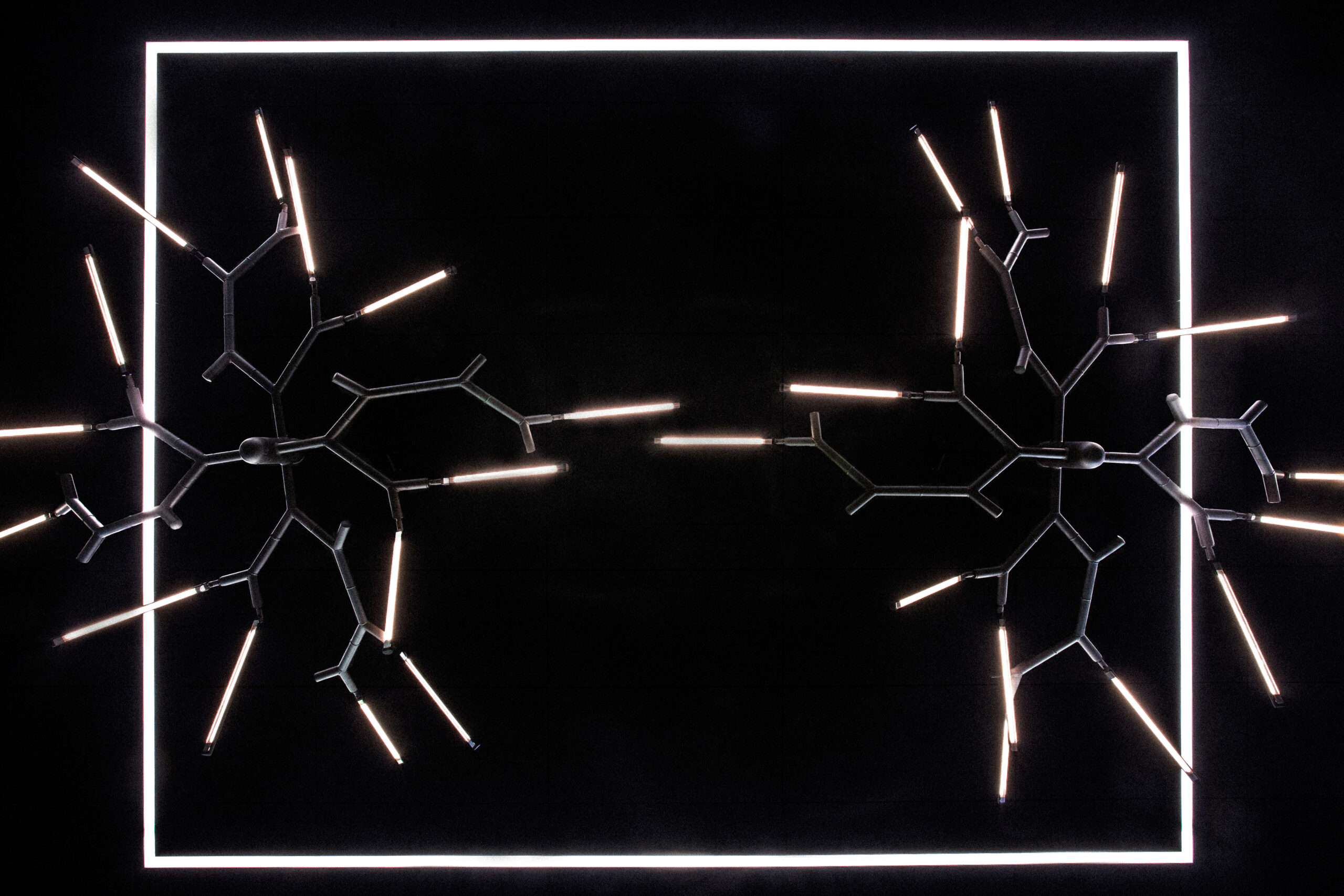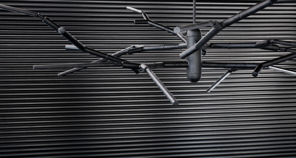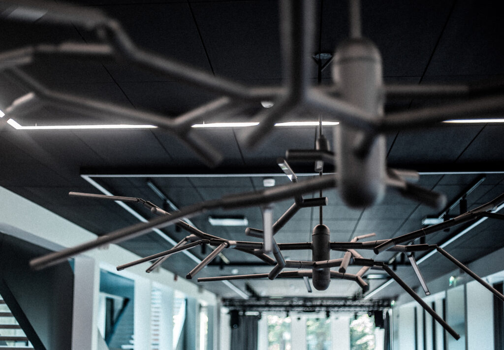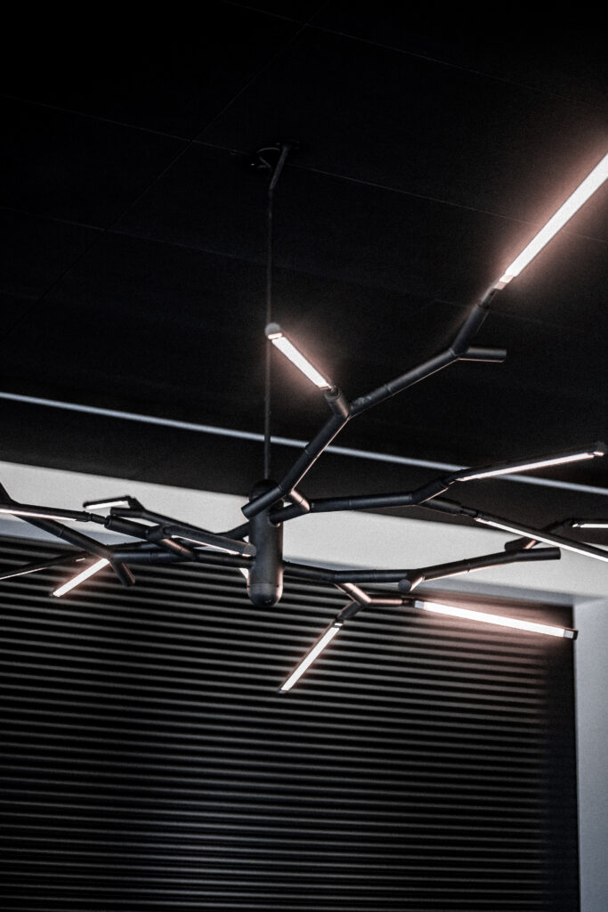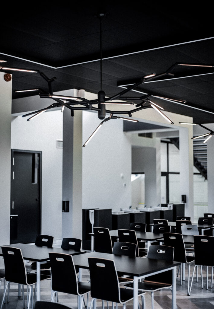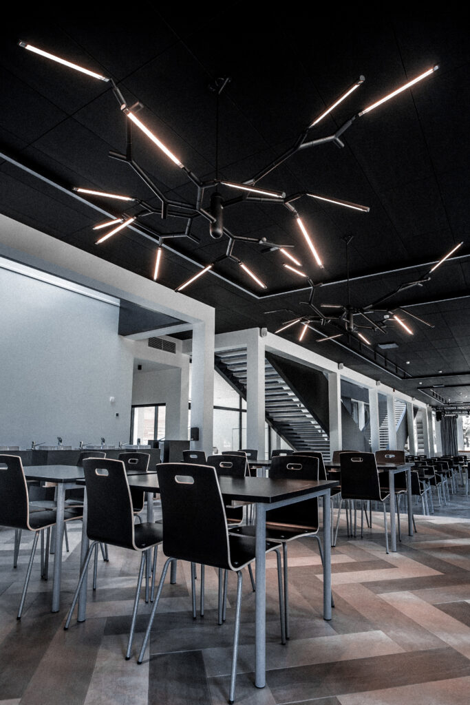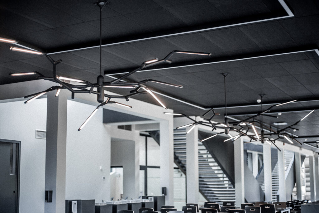 Branch Chandelier, a modular contemporary chandelier, is installed in the cafeteria and lounge area at Rapla High School, providing interior lighting for a flexible social and study space. The chandelier draws inspiration from the structure of tree branches, with aluminium tubes arranged in a controlled yet varied composition that forms a sculptural architectural lighting element suited to educational and public interiors.
